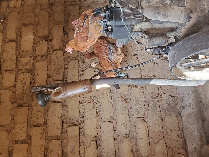This scene, located in Mangu, Nigeria, depicts an indoor or sheltered space with a rough, light-brown mud brick wall forming the background. In the foreground and midground, a stationary, dark-colored engine or generator occupies the right side, featuring a large flywheel, visible filters, and various mechanical components. Perched on and around this machinery are multiple brown and reddish-brown chickens, including a prominent hen with a red comb and wattle resting on top of the engine. To the left of the machinery, a metal funnel is inserted into an aged, light brown plastic bottle, both suspended from a vertical support pole. A second, dirty plastic bottle hangs from the right side of the engine. No human presence is observed.