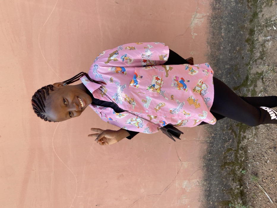A young Black female stands outdoors in Akwanga, Nigeria, positioned slightly to the left of the frame against a faded reddish-orange painted wall. She faces the camera directly, displaying a broad smile that reveals her teeth. Her hair is styled in numerous small, dark braids. She wears a black stud earring in her left ear and a thin, light-colored chain bracelet on her left wrist. Her attire consists of a black long-sleeved garment worn under an unbuttoned, short-sleeved, collared shirt. The pink shirt is patterned with a repeating motif of various cartoon characters, including those identifiable as Tom, Jerry, and Spike the dog. A small black purse with a thin chain strap is slung across her body, resting on her left hip. She is wearing black leggings, with a partial white "NIKE" logo visible on her lower left leg. Her left hand is raised to chest level, forming a V-sign with her index and middle fingers extended. The lower portion of the background wall shows darker discoloration and patches, consistent with environmental exposure, with a visible dirt or concrete surface at its base.