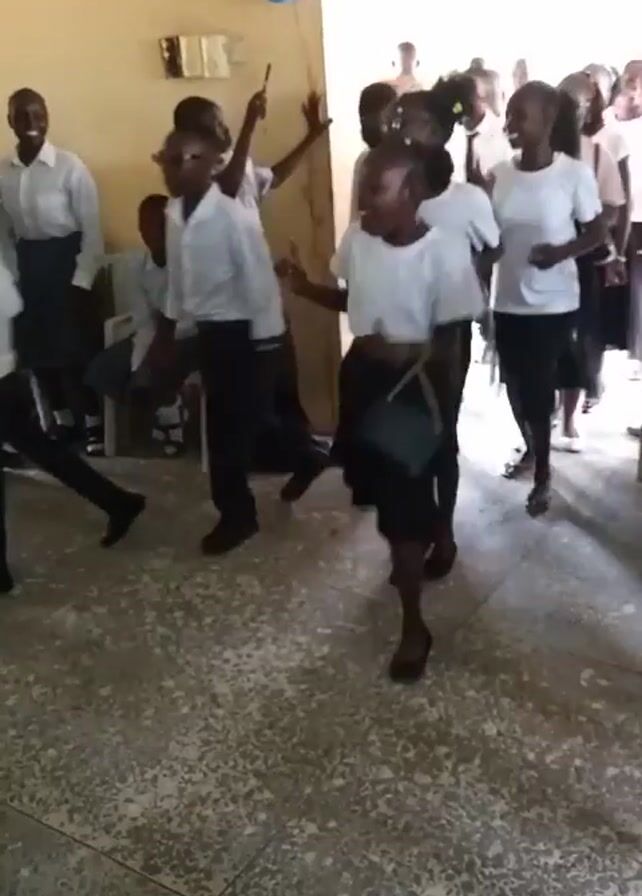 In an indoor setting, a group of about ten young people dressed in white tops and black skirts or trousers are dancing and moving energetically to music