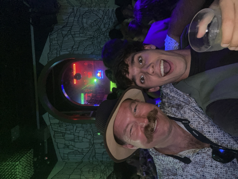 The image depicts two males posing for a photograph inside a dimly lit bar or nightclub, located in Porto, Portugal