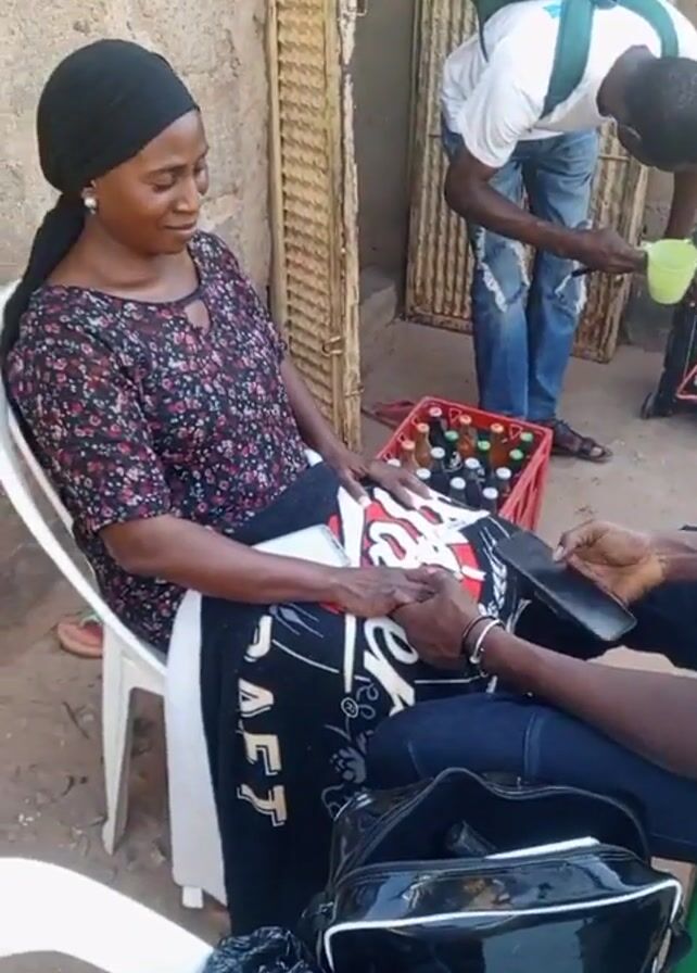 A woman wearing a floral blouse and head covering sits on a white plastic chair, smiling. A man sits next to her on a green plastic chair, looking at a phone. A black patent leather bag sits at their feet. Behind them, a man with a backpack is bent over, pouring a liquid from a yellow plastic cup. A red crate of beer bottles is near the door. The scene appears to be outdoors, next to a brick building.