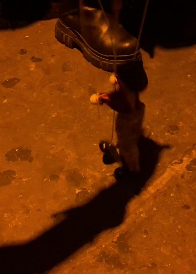 A marionette is being operated. The puppet is humanoid, wearing dark shoes, light pants, and a red shirt. A hand with a red bracelet is seen holding the control bar above the puppet, manipulating its strings. The scene is lit with an orange light, casting a long shadow of the puppet on the concrete ground. A person wearing black boots is standing next to the puppet.