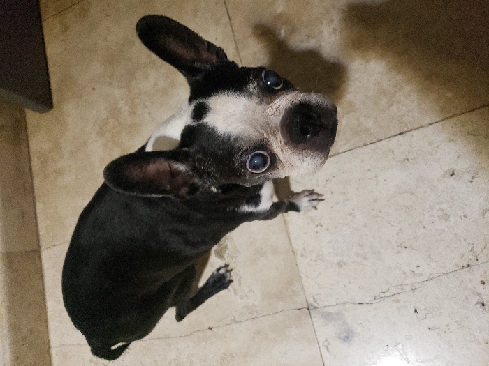 - "A small, black and white Boston Terrier dog stands centered on a light-colored, square-tiled floor" by FM-zKXAq1, licensed under CC BY 4.0