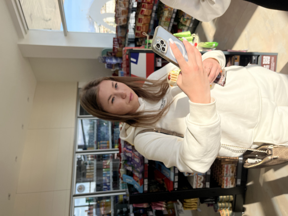 The scene depicts the interior of a convenience store, specifically identified as a minimarket within a Petrol gas station in Nikšić, Montenegro, evidenced by a distinct blue and red "L" shaped logo on a display unit. In the foreground, a woman with light brown, shoulder-length hair is centered, wearing a white hooded sweatshirt and matching white pants. A light brown shoulder bag with a patterned strap hangs on her right side. Her attention is focused downward on a light-colored smartphone (consistent with an iPhone Pro model, featuring a triple camera array and a visible MagSafe ring) held in her right hand with her nails painted white. In her left hand, she holds a small pastry or cupcake with white frosting and a red topping. To the woman's right, a partial view of a second individual, dressed in a dark top and white bottoms, is visible. The background reveals typical convenience store shelving units. To the left, several multi-door refrigerated display cases are stocked with various beverages. Adjacent shelves hold snack items in colorful packaging, with rows of Nutella jars clearly visible on a lower shelf. To the right, additional shelves contain various packaged goods. Bright overhead lighting illuminates the store, complemented by natural light streaming in from a large window on the far right. Through this window, a clear blue sky, distant mountains, and a distinctive white architectural structure with an arched design are visible. The floor is light-colored.