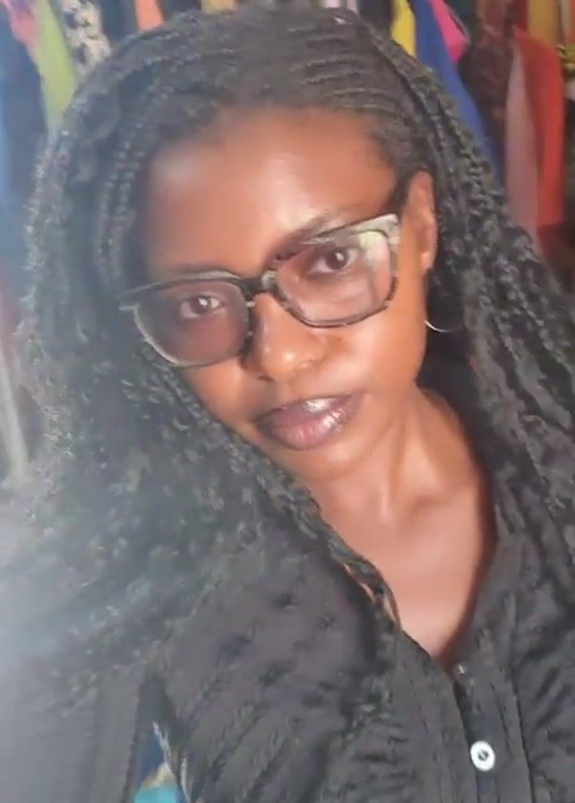 A medium-lit indoor scene features a woman with dark skin, wearing large rectangular glasses and a black blouse with a button. She has long, dark, braided hair. The woman is sitting in a blue plastic chair wearing jeans. The background contains a rack filled with colorful clothing. She waves her hand in front of the camera and adjusts her glasses.