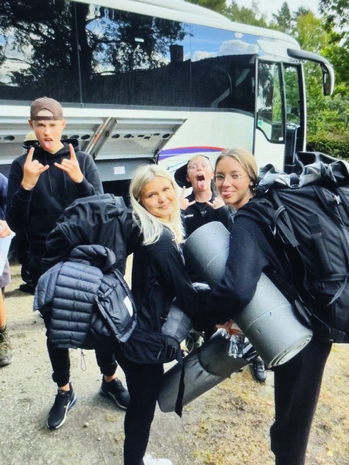 The image depicts four young individuals, appearing to be adolescents or young adults, standing outdoors in Charleroi, Belgium, in front of a white and dark grey passenger coach bus with its side cargo bays open. The ground is unpaved, consisting of dirt and gravel, with trees visible in the background and reflected in the bus windows. From left to right: 1. A male, wearing a dark hoodie and a backward brown baseball cap, extends his tongue and forms "rock-on" hand gestures with both hands. He carries a dark backpack, to which a folded dark puffer jacket is attached. He wears dark pants and black sneakers. 2. A blonde female with shoulder-length hair smiles towards the camera. She wears a dark long-sleeved top and carries a dark backpack. She is holding one grey rolled mat. 3. A person with light-colored hair and glasses, positioned behind the blonde female, has their mouth wide open with their tongue extended and performs a "rock-on" hand gesture with their left hand. They wear a dark shirt. 4. A female with long dark hair and glasses looks towards the camera with a slight smile. She wears a dark long-sleeved top and carries a large black backpack. She is holding at least two grey rolled mats, one of which exhibits a white/silver patch, possibly tape or a repair. She wears dark pants. The individuals are posed for the camera, exhibiting playful expressions and gestures while handling personal luggage and camping equipment.