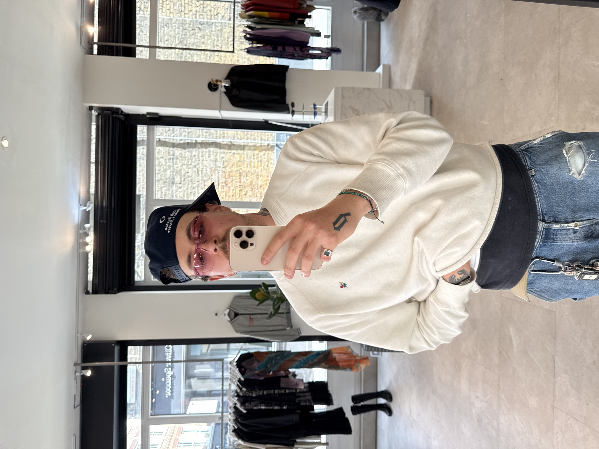 A person wearing pink sunglasses, a dark-colored baseball cap, and a white sweater is taking a selfie with an iPhone in what appears to be a clothing store. The person is also wearing blue jeans with rips and a black undershirt. The store has various clothing racks and displays visible in the background. Through the windows, urban architecture is discernible, suggesting a city location; the specific London location cannot be determined from this image alone.
