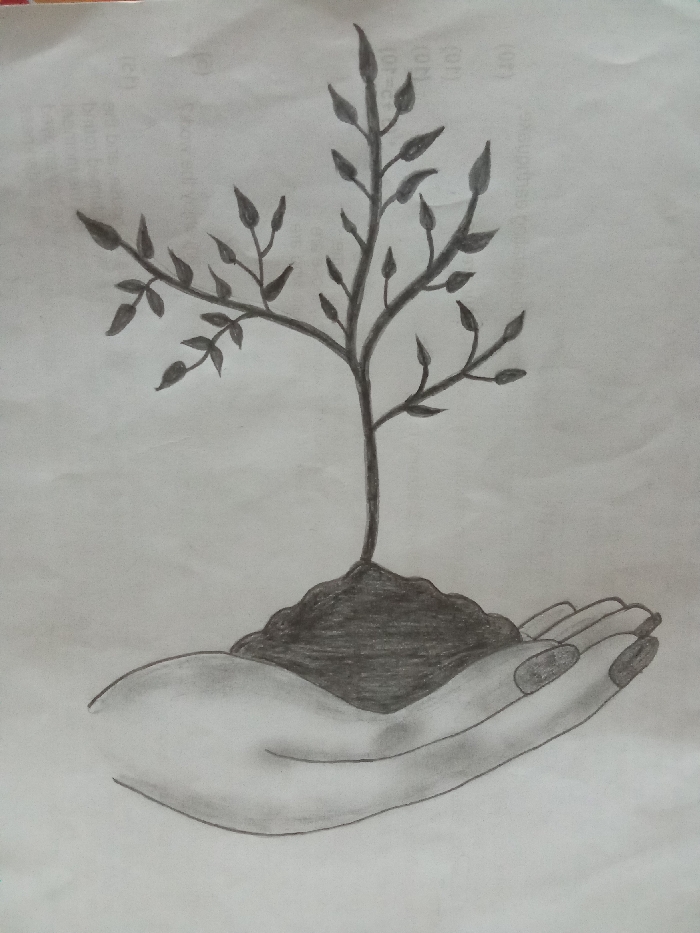This image is a monochrome pencil sketch rendered on a piece of light-toned paper. The central subject is a human hand cupped upwards, supporting a dark, textured mound of soil. From this soil, a slender sapling with numerous small, ovate leaves emerges, its branches extending upwards. The hand is depicted in profile, showing five fingers with subtly darkened fingernails. Faint, ghosted textual or numerical markings are visible through the paper beneath the drawing. The image depicts a drawing on paper and does not represent a physical location in Quetta, Pakistan, or any other city.