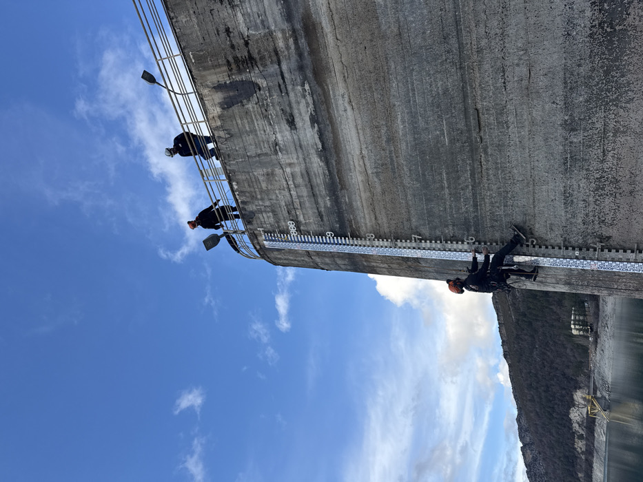 The image displays a scene at the Castillon Dam, near Castellane, France, under a partly cloudy blue sky. A large, textured concrete dam wall dominates the right side of the frame. Attached vertically to the wall is a prominent white and blue water level gauge marked with numbers, including "800" near the top, followed by "9," "8," "7," and "6" in descending order. One individual, dressed in dark work attire, an orange hard hat, and a black safety harness, is positioned on the lower left section of the concrete wall, actively rappelling or descending, with hands touching the water level gauge. Two other individuals stand on the top edge of the dam, behind a metal railing. The person on the left wears dark clothing and an orange hard hat, while the person on the right wears dark clothing and a white hard hat. Both individuals on top appear to be observing the rappelling person below. The environment includes a large body of calm water, presumably a reservoir, at the base of the dam, reflecting the sky. In the background to the left, a distant mountainous or hilly landscape with sparse vegetation is visible. Two black streetlights are mounted on poles along the top edge of the dam wall, behind the railing.