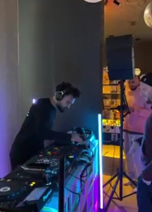 A DJ with a beard and headphones stands behind a Pioneer DJ setup, including turntables and a mixer, in a bar-like setting with blue and purple LED lights. He nods to a man in a beanie who gives him a fist bump. Two other people are visible in the background, and the bar has a modern aesthetic with a light-up display shelf. There are speakers to the right of the DJ.
