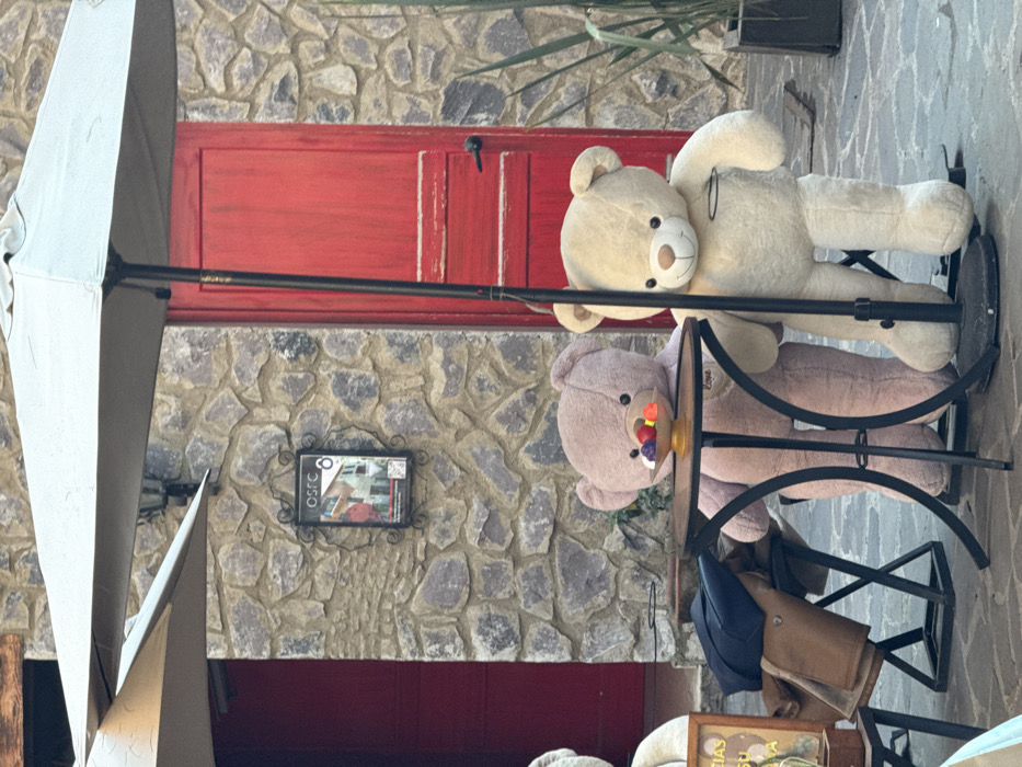 Two stuffed bears are arranged on a metal stand outdoors against a stone wall. The top bear is cream-colored, while the lower bear is pink and appears to have colorful objects near its mouth. An umbrella is partially visible on the left. A red door is centered in the background behind the teddy bears. A small sign hangs on the stone wall beside the lower teddy bear. A blue hat and a tan bag are hanging near the bears as well.