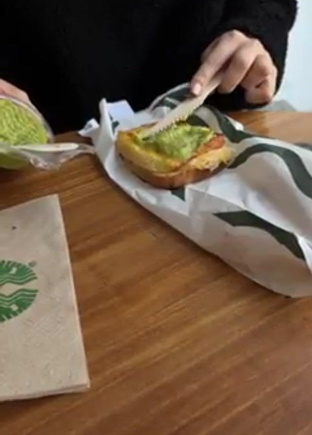 A person wearing a black sweater spreads a green substance onto a piece of toast or pastry using a small wooden utensil. The toast is resting on Starbucks branded wax paper. There is a Starbucks napkin to the left and a container of the green substance next to it. The scene takes place on a wooden table.