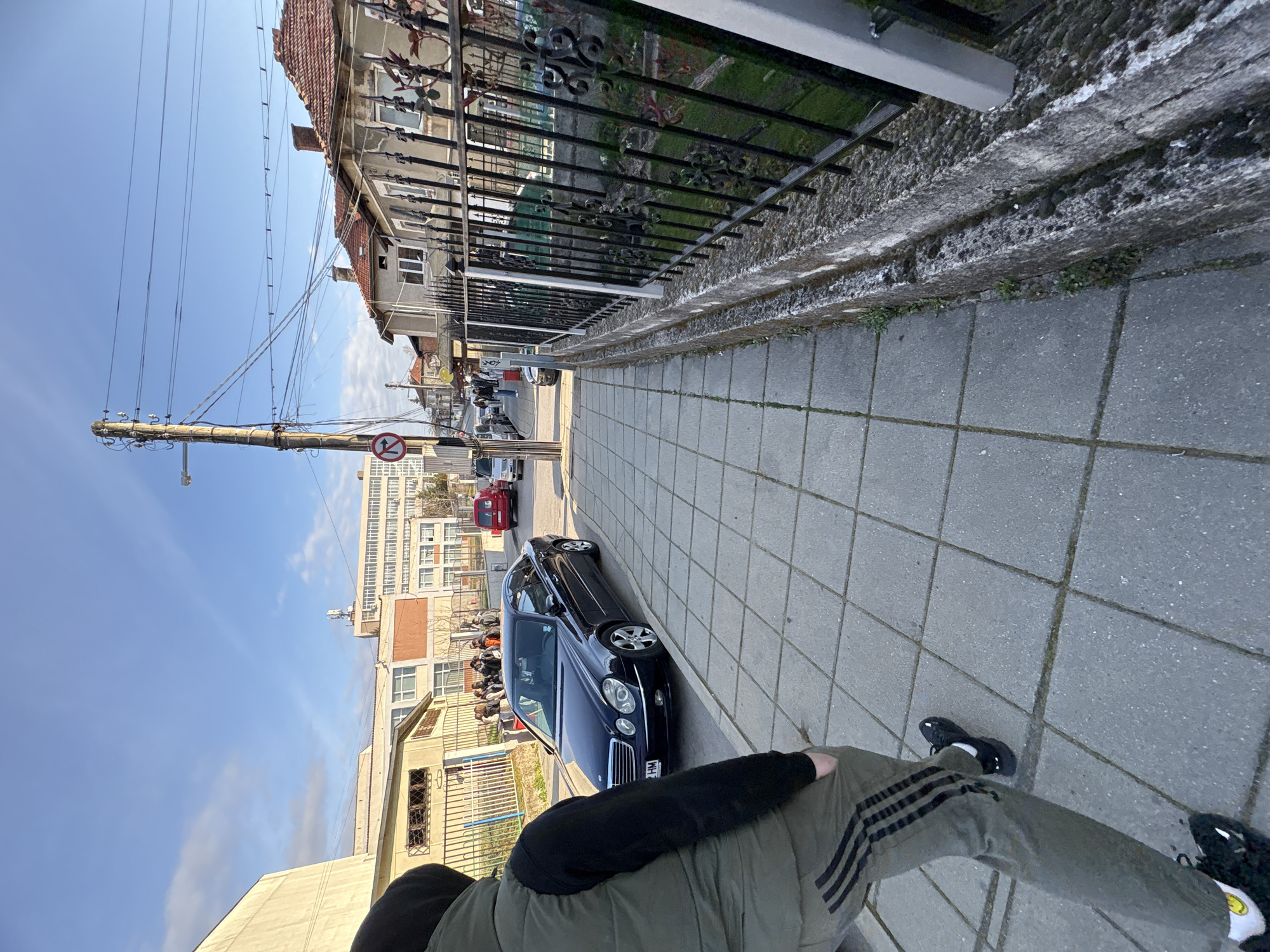 The image depicts an urban street scene in Goce Delcev, Bulgaria, viewed from a pedestrian's over-the-shoulder perspective on a sidewalk. In the foreground, a person is walking away from the camera, wearing a dark hooded top, an olive green puffer vest, and olive green track pants with three black stripes on the outer seams. They wear black athletic shoes, with a white sock featuring a yellow smiley face visible on their left foot. The person is on a sidewalk composed of light grey square concrete tiles. To the immediate right of the sidewalk, a weathered concrete retaining wall is visible, topped by a black wrought-iron fence with decorative scrolls. Beyond the fence lies a patch of green ground with sparse vegetation. Further down this side of the street, several older residential buildings with red-tiled roofs and light-colored facades are present. To the left of the sidewalk, an asphalt road runs parallel. A dark-colored Mercedes-Benz E-Class sedan (W211 model) is parked curb-side, displaying a partially visible Bulgarian license plate ending in "M". Further along the road, a red van and other vehicles are parked or in motion. Beyond the parked Mercedes, a group of approximately ten individuals, appearing to be students, are gathered near the entrance of a light-colored building with large windows. In the background, a larger, multi-story institutional-style building with numerous windows and a rooftop antenna is visible. A smaller building with barred windows is closer to the street on this side. A prominent wooden utility pole, laden with multiple overhead power lines and a street lamp, stands centrally in the mid-ground. A circular red "No Entry" traffic sign is attached to a pole near the utility pole. The sky is clear blue with scattered white clouds, indicating daytime conditions.