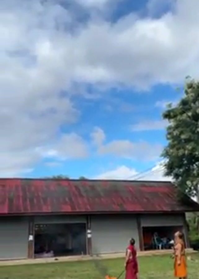 Two people dressed in traditional Buddhist monk robes stand on a grassy field near a building with a red roof. The person on the left is sweeping the grass, while the person on the right is observing the sky. The camera pans up to reveal a small, decorative hot air balloon ascending into a cloudy sky. Smoke trails behind the balloon as it rises.