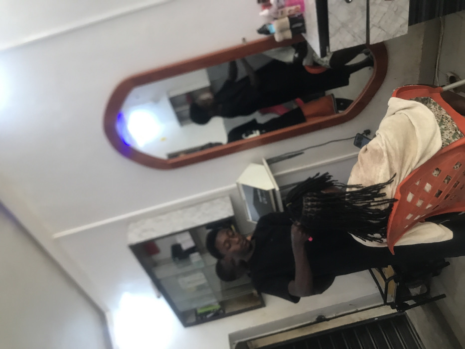 A person is braiding the hair of another, who sits in an orange plastic chair draped with a white cloth. A dark-skinned individual in a black shirt focuses on the hair. In the background, a mirror hangs on the wall, reflecting the scene with toiletries above. Below the mirror, a glass display cabinet is visible. The room has light-colored walls and what appears to be a ventilation system on the lower portion of the wall.
