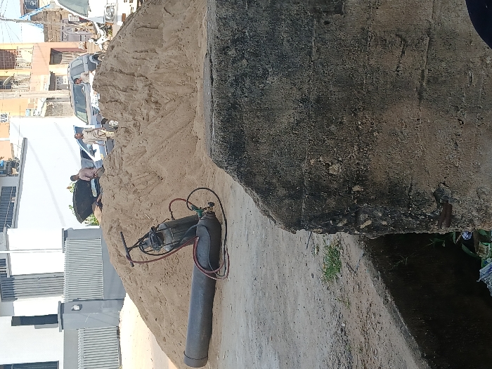 This image depicts an outdoor urban scene in Sardauna, Nigeria. A substantial pile of light brown sand dominates the midground, situated on unpaved dirt ground. In front of the sand pile, two dark gray gas cylinders are present: one long cylinder lies horizontally, and a shorter, fatter cylinder is tilted, equipped with a red hose and regulator. To the immediate foreground right, a weathered concrete block partially obstructs a concrete drainage ditch containing refuse. In the background, behind the sand pile, two adult males are visible; one stands upright, while the other appears to be attending to a dark, large object, possibly a wheelbarrow or container. A silver SUV is parked behind the sand, with a smaller individual partially visible near its rear. Further right, a white van and a motorcycle are partially visible, with multiple multi-story buildings of varying architectural styles comprising the backdrop. A white building with a gray fence and pillars is visible in the background to the left. The sky is clear.