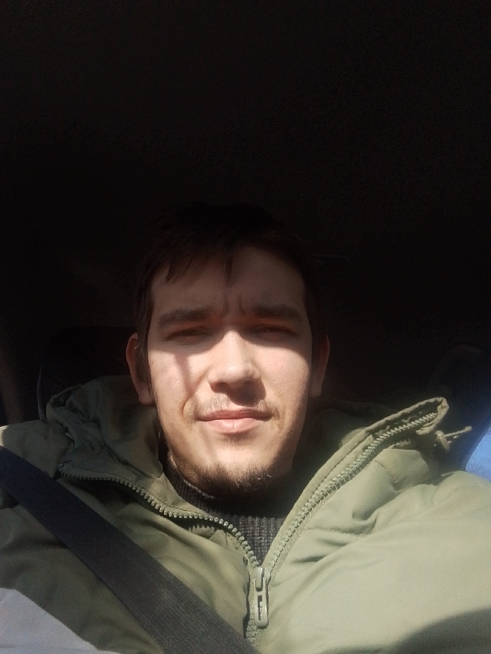 The image displays a male subject, estimated to be in his late 20s to early 30s, positioned within the interior of a vehicle. He has short brown hair and stubble on his chin and upper lip. The subject is wearing a dark green or olive-drab padded jacket over a dark, possibly knitted, turtleneck sweater. A dark seatbelt extends diagonally across his chest from the left shoulder to the lower right. Direct sunlight illuminates the right side of his face and upper torso, creating a distinct line between light and shadow on his face and casting a shadow on the left side. He is looking directly at the camera with a neutral to slightly smiling expression. The background is uniformly dark and out of focus, revealing no specific details of the vehicle's interior beyond what appears to be a seat structure behind him. There are no visual cues or landmarks present in the image to identify a specific location within the city of Saint Petersburg, Russia.