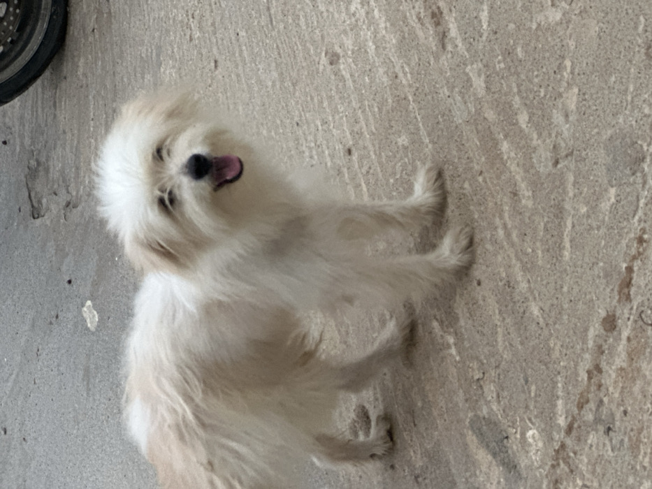 The scene depicts a small to medium-sized canine, presumably in Lugbe, Nigeria. The dog possesses predominantly white, long, shaggy fur with light beige or tan patches visible on its back and flanks. Its face is covered in shaggy white fur, with a dark nose. The dog's mouth is slightly open, revealing a pink tongue, suggesting panting or a smiling expression. Its eyes are partially obscured by fur. The animal stands on all four legs, oriented slightly towards the right of the frame, facing the viewer. The ground beneath the dog is a light grey concrete or paved surface, exhibiting various textures, minor cracks, and discolored areas. In the upper right background, a segment of a dark vehicle tire with a metallic rim is partially visible. No other individuals or significant objects are discernable.