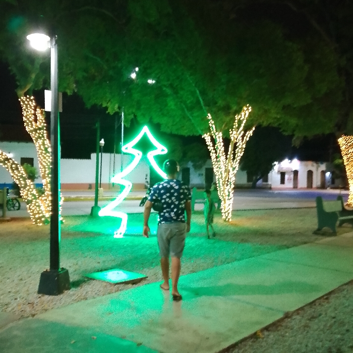 A man walks away from the viewer in a park at night. A neon green Christmas tree stands in the center, illuminated by an unseen light source. Trees are strung with white lights. The man is wearing a blue patterned shirt, gray shorts, and sandals. In the background, white buildings with dark roofs are visible, and a bench sits nearby. A street light is located to the left of the man.