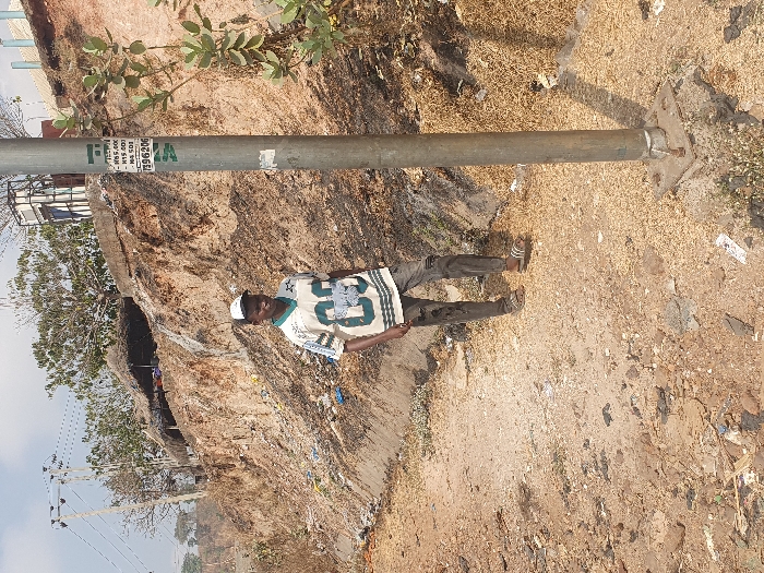 The scene, located in Burwood, Australia, depicts a single male subject standing on a dry, uneven dirt path in an arid outdoor environment. The man, positioned slightly left of center, wears a white baseball cap, a light-colored t-shirt with a green "83" graphic, dark pants, and sandals. He faces forward, looking directly at the viewer. To the right of the path, a steep, eroded dirt embankment rises, showing patches of blackened soil and sparse, dry vegetation, along with scattered refuse including plastic debris. On top of the embankment, several structures with thatched roofs are visible, along with a white building or container. In the foreground, on the right, a tall, grey metal pole stands vertically, anchored to a concrete base. This pole bears multiple adhesive stickers, one of which displays financial figures prefixed with 'N' (e.g., N5,000, N15,000, N500) and a seven-digit number '7396206'. In the background, utility poles with power lines are suspended on the left. The sky is hazy and light-colored.