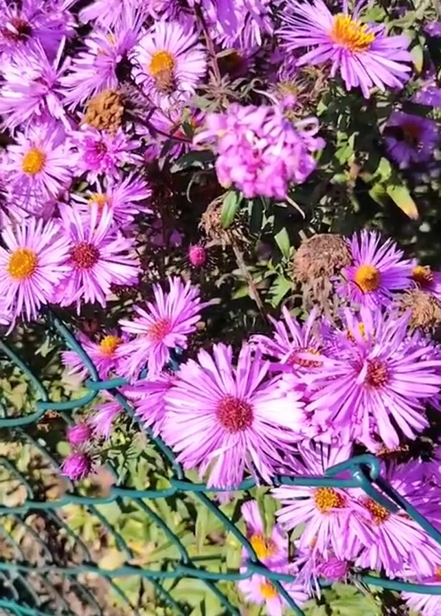The video showcases a dense cluster of purple aster flowers, each with a prominent yellow center, in full bloom. Some of the flowers are slightly wilted, with their petals drooping, and there are a few brown, dried flower heads scattered among the fresh ones. A green wire fence runs horizontally across the lower portion of the frame, partially obscuring the flowers. The scene is brightly lit, suggesting a sunny day.