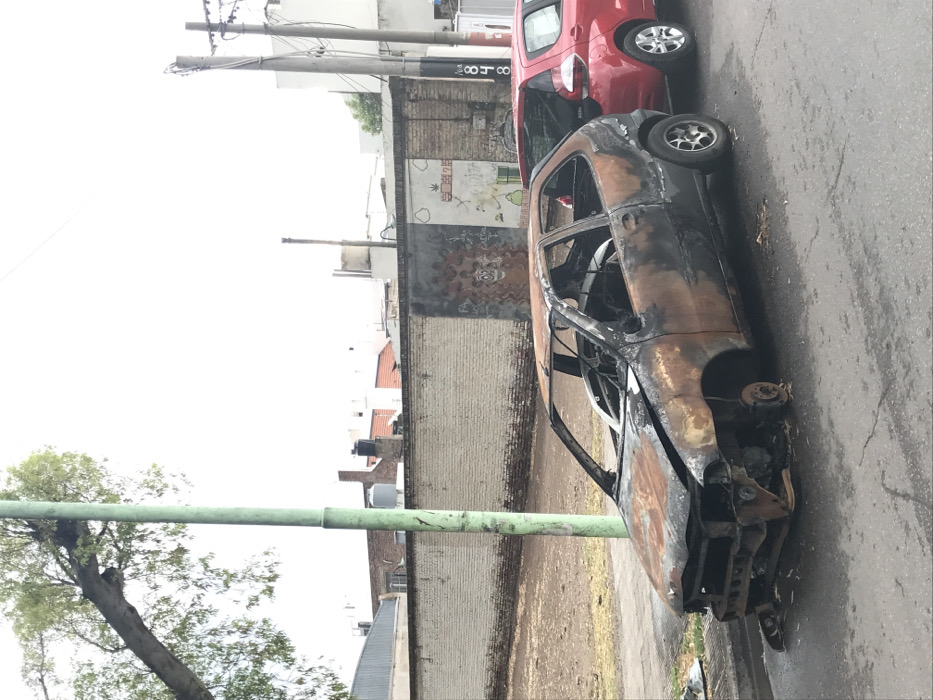 - "A burnt-out car hulk sits on an asphalt street beside a red vehicle" by FM-7l6eJ3, licensed under CC BY 4.0