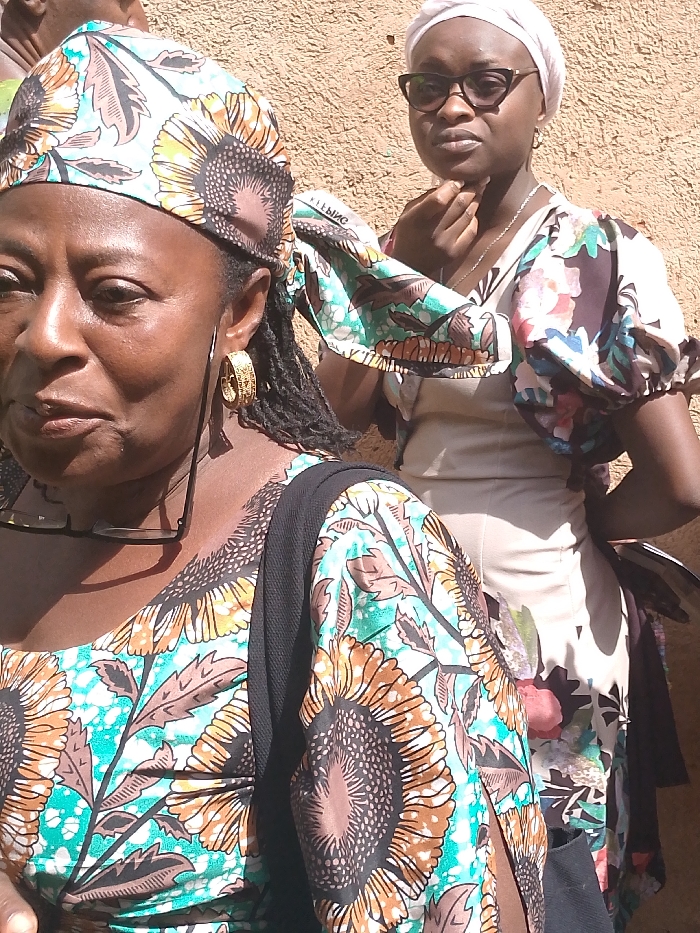 The image depicts two adult women positioned outdoors against a light brown, textured wall. The precise location within Bukuru, Nigeria, is not identifiable from the visible details. The woman in the foreground, partially cropped on the left and top, has a dark complexion. She wears a headscarf and a garment featuring a large sunflower-like pattern in shades of brown, orange, and black, against a teal and white speckled background. A gold-colored, circular, intricately patterned hoop earring is visible on her right ear. Black-framed eyeglasses are suspended from her neckline. A black strap, consistent with a shoulder bag, is visible over her right shoulder. Her head is turned slightly to the left, and her mouth is slightly ajar. The woman in the background, positioned to the right and appearing younger, also has a dark complexion. She wears a light-colored headwrap and black cat-eye eyeglasses. Her attire includes a light-colored dress with floral-patterned puffed sleeves in various colors, including pink, blue, green, and brown. A silver-colored chain necklace is visible. Her right hand is raised, with fingers touching her chin. Both individuals are illuminated by strong, natural daylight.