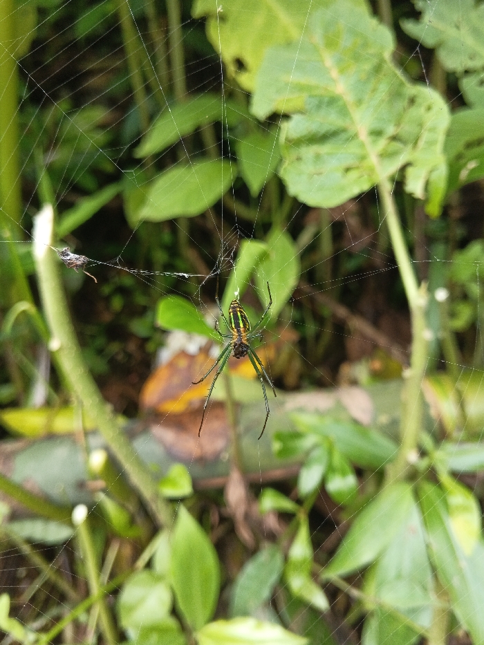 A spider hangs in its web amidst a lush green environment. The spider has an elongated body with a distinct pattern of dark and light stripes running down its back. Its long, slender legs are mostly dark. The web is intricately woven between green plants, with leaves and stems providing anchor points. Debris, possibly captured prey, is also visible in the web. The background consists of varying shades of green, creating depth and highlighting the web and its occupant.