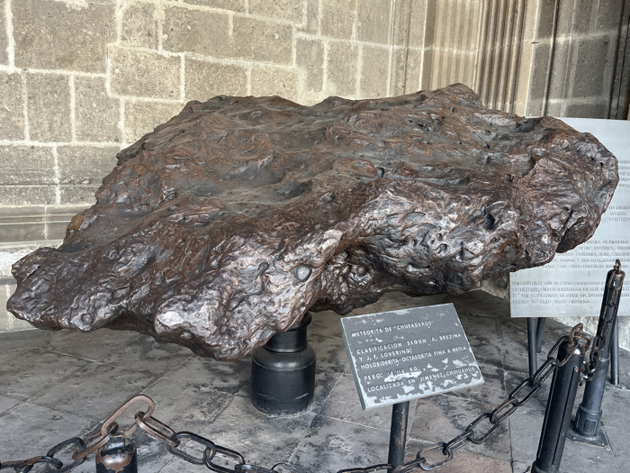 - "A large, dark-colored meteorite sits on a black metal stand, enclosed by a chain barrier" by FM-21Qs12, licensed under CC BY 4.0