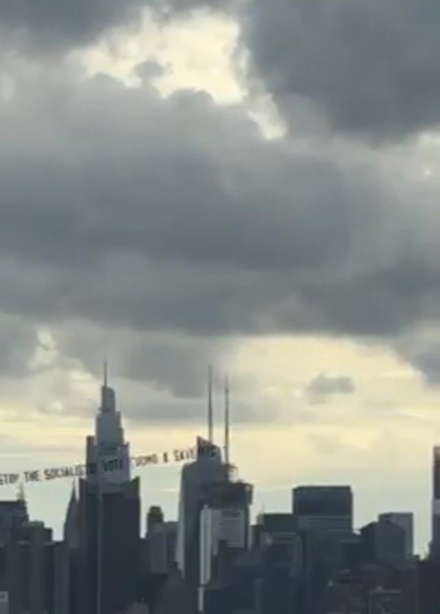 A long shot shows a banner being flown over a city skyline. The banner reads, "STOP THE SOCIALISTS! VOTE CUOMO & SAVE NYC". The sky is overcast and the skyline is dominated by tall buildings. A white van appears in the foreground.