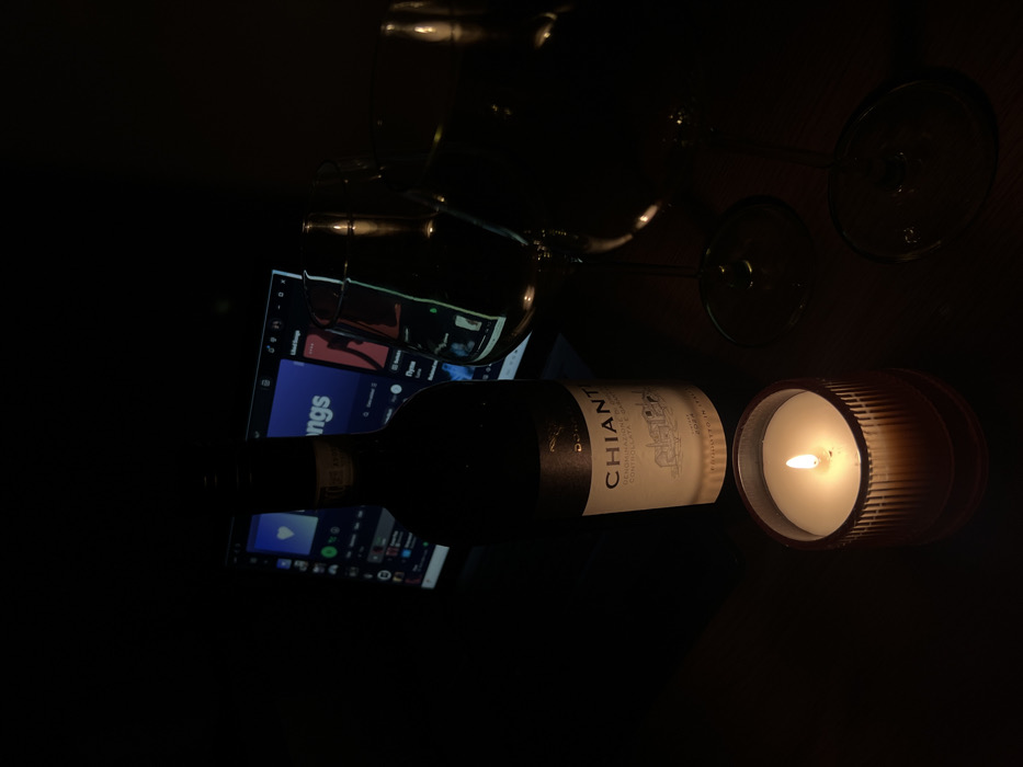 The scene is an indoor, dimly lit setting in Sherburn in Elmet, United Kingdom. A dark bottle of 2020 Chianti wine, featuring a white label, stands prominently in the foreground. To its right, a lit candle in a ribbed, translucent holder provides the primary warm illumination. Two empty, clear stemmed wine glasses are positioned beside the candle, one slightly behind the other. In the background, a laptop screen glows with a blueish light, displaying a music streaming application interface with the word "Songs" visible. The objects rest on a dark, flat surface. No individuals are present in the image.