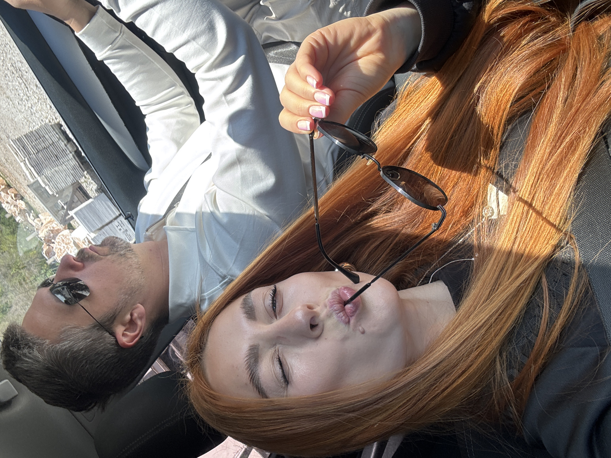 The image depicts two individuals in what appears to be the interior of a vehicle. A woman with long, auburn hair is positioned at the foreground, holding a pair of sunglasses in her hand with manicured nails. Her eyes are partially closed, and her lips are pursed. Behind her, a man is visible with sunglasses perched low on his nose. He has short hair and facial stubble. Both are dressed in light-colored clothing. The background shows a view from a high vantage point, with buildings and landscape suggesting a location in Zagrađe, Montenegro. The overall impression is that of a couple relaxing and taking in the scenery.