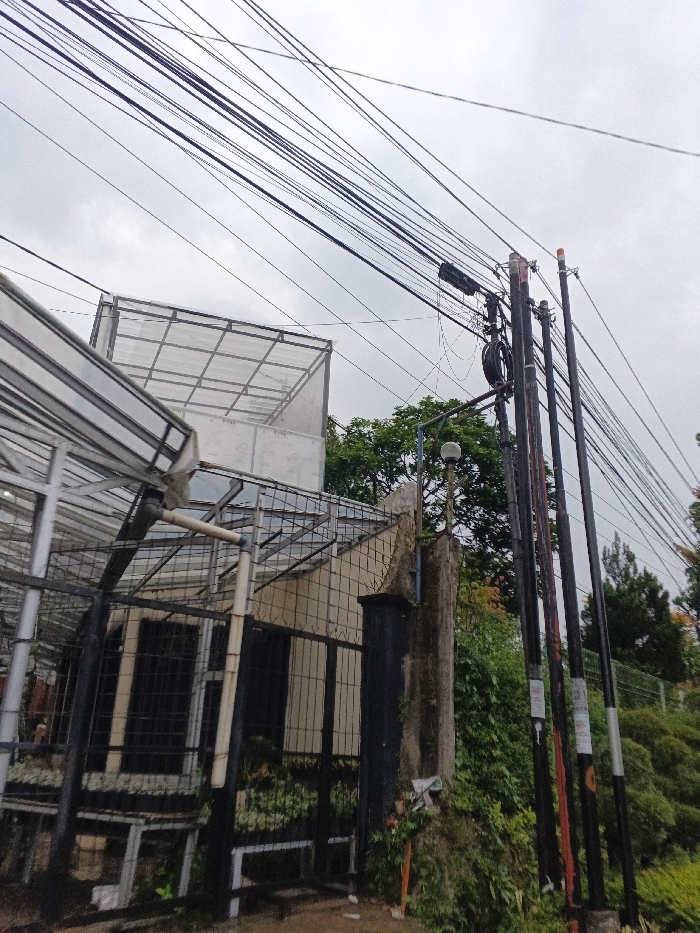 This image, captured in Carmen, Philippines, displays an outdoor urban or semi-urban environment under an overcast sky. The scene is dominated by a complex network of overhead black utility lines stretching across the upper half of the frame. On the right side, multiple dark utility poles stand vertically, heavily laden with these cables. One prominent pole features a black utility box and a tightly coiled bundle of black cable. Two poles are distinctly capped with orange at their uppermost points, and several rectangular white labels or posters are affixed to their surfaces. Adjacent to a rugged concrete pillar, a street light fixture with a spherical translucent globe lamp extends from a pole. On the left, a building is partially visible, characterized by a multi-tiered roof structure composed of a light-colored metal frame supporting translucent or clear panels, suggesting a greenhouse or covered extension. Below this, a portion of the building's facade with dark-framed windows is discernible behind a dark metal fence and gate. Lush green vegetation grows within the fenced perimeter, at the base of the concrete pillar, and along the gently sloping terrain to the right of the pillar. The immediate foreground consists of an unpaved ground surface. In the background, beyond the primary structures, a hillside densely covered with trees and foliage is visible. No human subjects or discernible activities are present in the image.