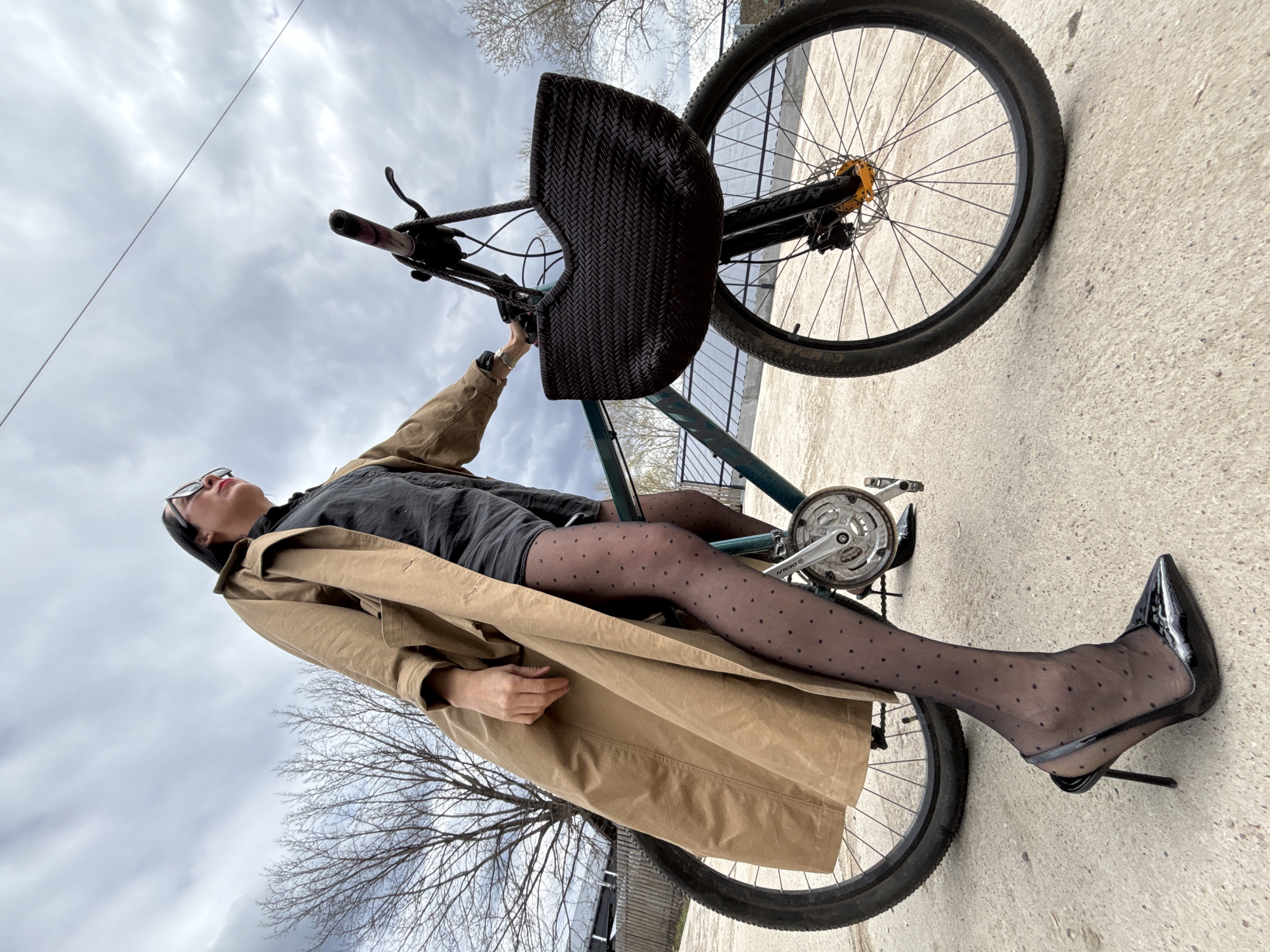 woman in Chaikovsky, Russia, posing with a bicycle. She is wearing a black dress, black polka-dot tights, and black high heels. She also has on a tan trench coat and eyeglasses. The bicycle has a black basket attached to the handlebars. The background shows an overcast sky and a few trees. The ground appears to be a concrete surface.