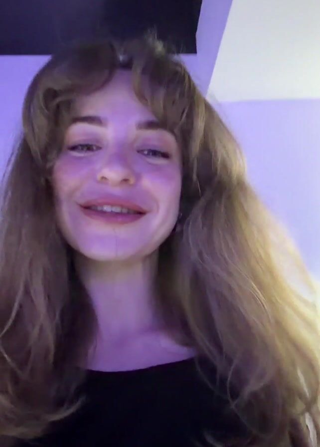 fair-skinned woman with reddish-brown hair and bangs, wearing a black shirt. She is smiling and looking directly at the camera. She touches her hair with her right hand. The background is a wall with a purple glow and a black ceiling panel.