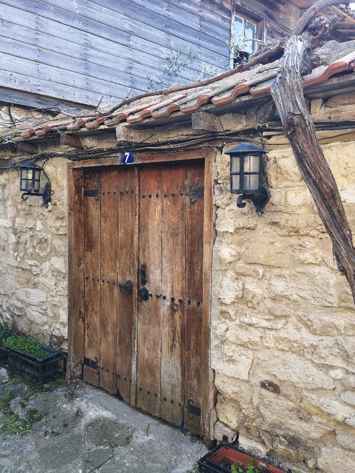 This image displays the facade of an aged building located in Nesebar, Bulgaria. A weathered, double-leaf wooden door, constructed from vertically oriented planks with visible black iron hinges and decorative studs, is centered within a wall composed of irregular, light-colored stone blocks. A blue oval plaque displaying the number "7" is affixed directly above the door's center. Two black wrought-iron style lanterns with glass panes are mounted on the stone wall, one on each side of the door. Above the stone wall, a narrow eave featuring Roman-style terracotta roof tiles is present. The upper portion of the building, visible above the eave, is clad with gray, horizontally oriented wooden planks, which include a small, open window with a light-colored frame on the right side. A thick, gnarled, leafless vine or branch extends from the upper right, diagonally traversing the roofline and partially descending the stone wall. Black electrical cables are strung horizontally along the wall above the door and lanterns. The ground directly in front of the door is paved with uneven stone slabs. Two black rectangular planters, each containing small green plants, are situated on the ground to the left of the door and partially visible in the lower right corner. No individuals or active interactions are present in the scene.