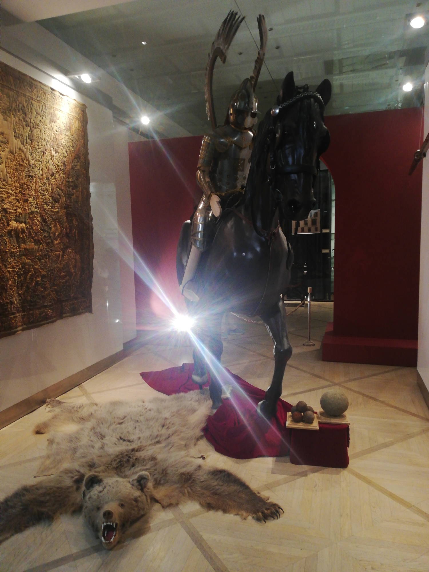 The image depicts an interior view of a museum exhibit, identified as being located in Nyasvizh, Belarus, likely within Nesvizh Castle. In the center, a life-sized, dark-colored equestrian statue is displayed. The horse, facing slightly left, is in a dynamic, rearing pose, wearing a bridle. Mounted on the horse is a mannequin adorned in a full suit of polished metal armor, characterized by large, feathered "wings" attached to its back, indicative of a Polish-Lithuanian Winged Hussar. The statue rests on a folded piece of deep red fabric on the floor. In the foreground, a large, light brown bear rug is spread flat on the floor, its head intact with an open mouth displaying teeth, facing the viewer. To the right of the bear rug, a small, square pedestal draped in red fabric holds two items: a wooden tray containing four dark, spherical objects (possibly cannonballs) and a larger, rough-textured stone sphere resting on another wooden base. The floor consists of light-colored tiles with a geometric pattern. The left wall features a large, textured tapestry or relief artwork in earthy brown and gold tones, illuminated by spotlights from above. The right background wall is painted a dark reddish-brown, with an archway leading to another dimly lit area. The ceiling is light-colored and features multiple recessed spotlights, one of which creates a prominent lens flare in the lower-central portion of the image. No people are visible.
