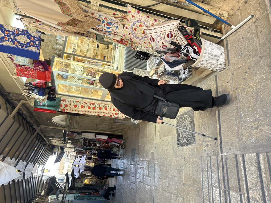 The image displays a narrow, stone-paved market alleyway within the Old City of Jerusalem, Israel, illuminated by natural daylight. A person, dressed in black attire including a head covering, long-sleeved top, wide-leg trousers, and boots, is the primary subject in the foreground, walking downhill. This individual wears dark sunglasses, carries a black "Jeep" branded messenger bag over their left shoulder, and uses a silver-colored cane in their right hand, which makes contact with the pavement. To the immediate right, a vibrant market stall is visible, featuring numerous colorful textiles, scarves, and embroidered fabrics hanging for display. Behind these, an illuminated glass display case exhibits various small decorative items, jewelry, and religious artifacts, including menorahs. A white woven basket on the ground level of the stall contains umbrellas and other merchandise. To the left, the alley continues with further market stalls under dark awnings, and several other individuals are visible walking or standing in the background. The overhead space of the alley is partially covered by a series of sloped structures, from which light fixtures are suspended. The stone pavement includes horizontal dark lines indicating steps and a circular metal manhole cover.