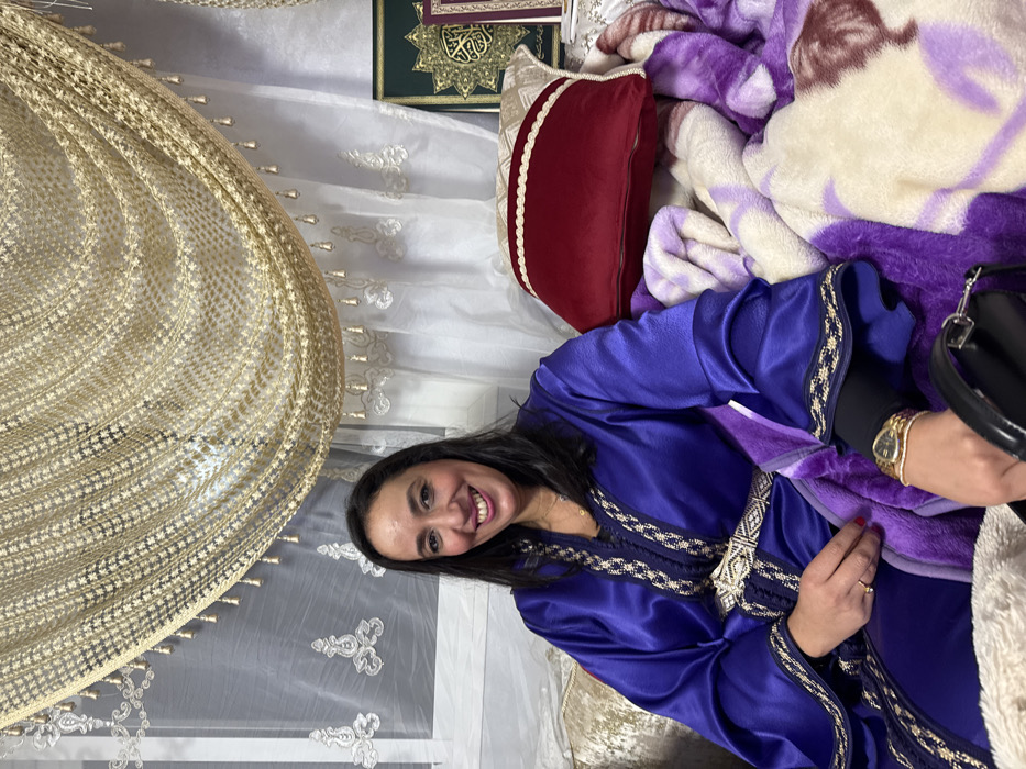 A woman smiles in a blue robe with gold trim, a black handbag nearby