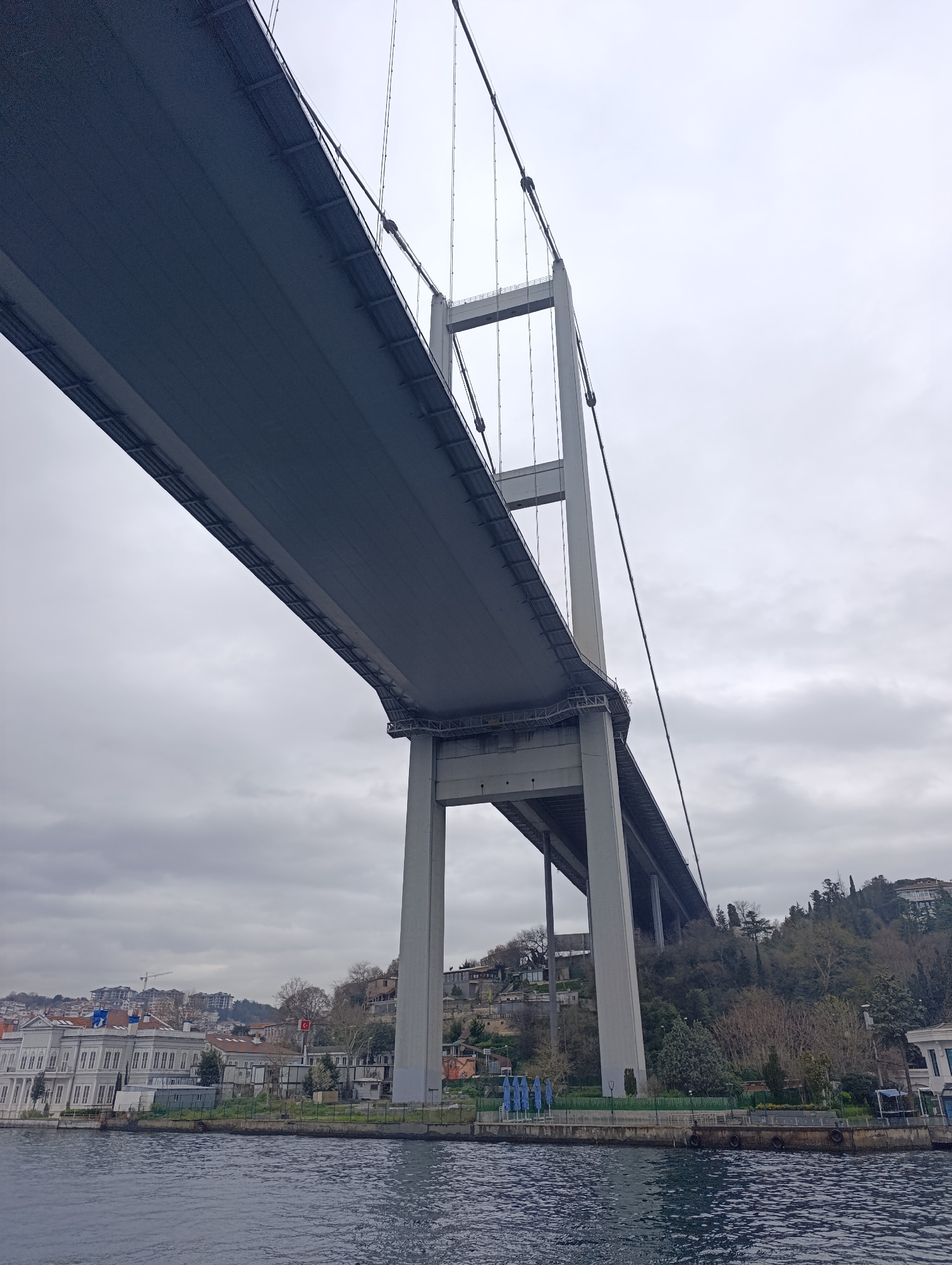 This photograph captures a low-angle view of a suspension bridge from the waterfront in Beşiktaş, Turkey. The concrete pier of the bridge is visible in the foreground, with the bridge deck extending overhead. The support cables stretch upwards toward the top of the image. The water of the Bosphorus Strait is in the lower portion of the image, reflecting the sky. Along the shoreline, there are white, multi-story buildings and some trees. On the hillside behind the buildings, there is dense vegetation and a few residences. In the middle of the embankment there are a few people next to the edge. The sky is overcast.
