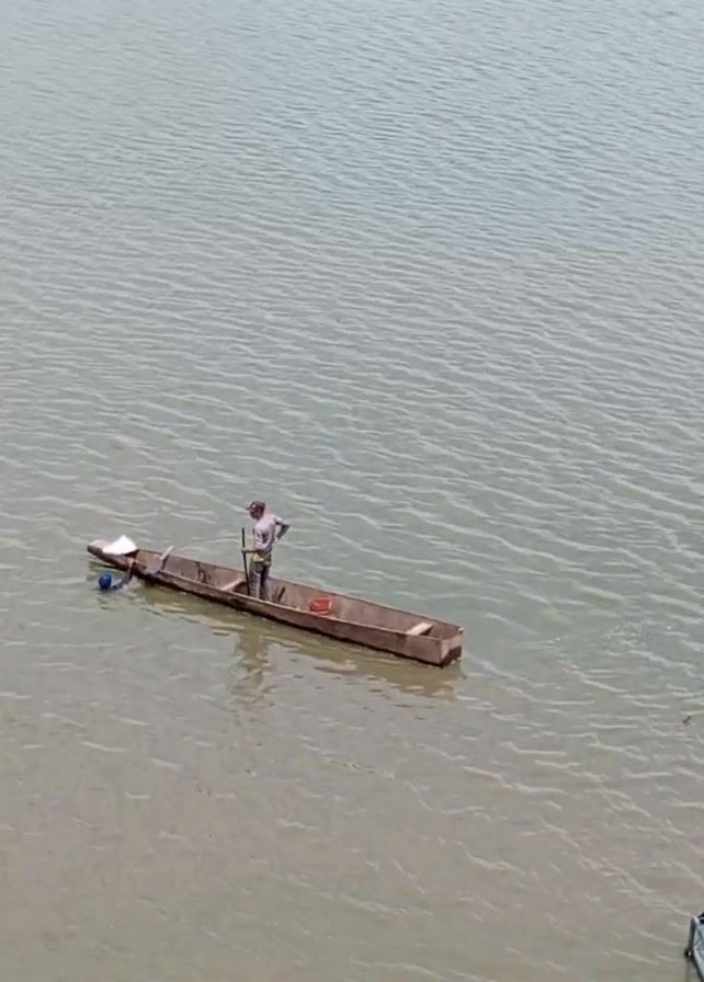 A man stands in a small boat on a body of water, possibly a lake or wide river. He is holding a long pole, perhaps using it to navigate or propel the boat. There is a bucket and a white sheet of material in the boat. Another structure is partially visible at the bottom right of the frame, possibly a platform or part of another boat. The water is calm with small ripples, and the sky is overcast.