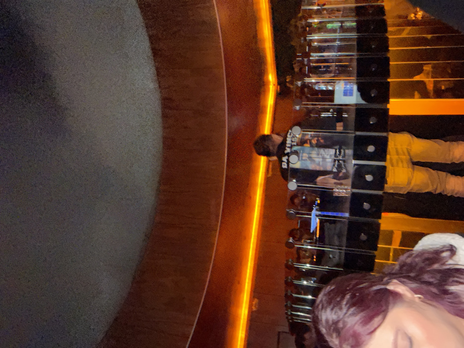 The scene is set inside Mandrake Condesa, Mexico City, Mexico, within a dimly lit, high-ceilinged cylindrical or domed space. A vibrant orange neon light strip runs horizontally along a curved, textured wall in the mid-upper section of the frame. In the immediate foreground on the left, the upper back and side profile of a person with long, wavy, dark purple hair are visible; their face is partially obscured and directed downwards. A small hoop earring is visible on their ear. In the midground, a male individual stands with his back to the camera, positioned behind a semi-circular or circular bar-like structure. He wears a black long-sleeved shirt featuring "DA VINCI" text and an architectural graphic on the back, paired with light-colored (likely tan) pants. The bar structure consists of clear panels above a dark, segmented base. Multiple clear cylindrical beverage dispensers, some containing liquids, are arranged on top of this structure. The male appears to be attending to these dispensers. Other blurry figures are visible in the background, suggesting additional occupants. The overall lighting is dim, dominated by the warm glow of the neon strip and ambient reflections on the bar structure.