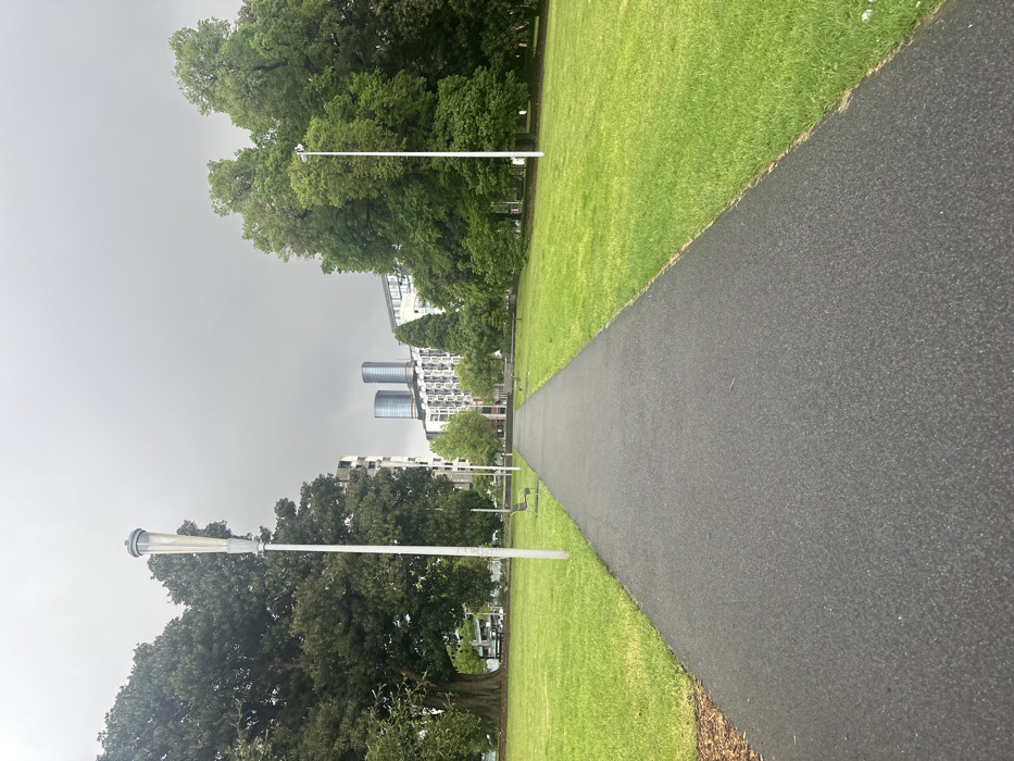 The image displays a paved pathway traversing an urban park in Carlton, Australia, under an overcast sky. The dark grey pathway runs centrally from the foreground into the distance, bordered on both sides by vibrant green grass. Numerous large, deciduous trees with dense green foliage are situated along the park edges. On the left side of the pathway, a tall, slender white lamppost with a decorative, elongated light fixture is prominent. Further along the pathway, on both sides, multiple empty park benches are visible. In the background, beyond the trees and other multi-story urban buildings, two distinctive, cylindrical, light-colored high-rise towers are visible against the grey sky. No individuals are present in the scene, and no specific actions or interactions are depicted.