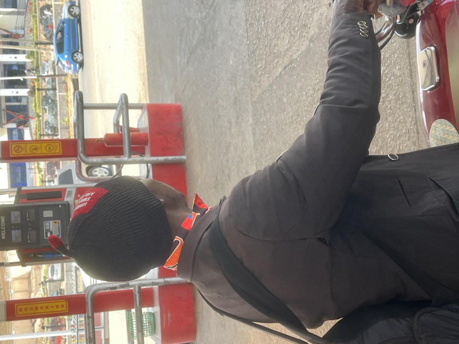 This image captures an individual on a motorcycle at a fuel station in an urban setting, consistent with the city of Jos, Nigeria