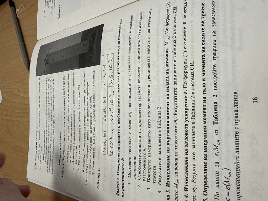 An overhead perspective captures an open textbook resting on a light brown wooden surface in Varna, Bulgaria. The textbook, displaying text in Bulgarian, features mathematical equations, a table labeled "Таблица 1" containing numerical data, and a black and white photographic illustration of a tall, cylindrical scientific apparatus, identified as likely an Oberbeck pendulum, on the right page. A section heading "Задача 1. Определяне на константата на махалото на Обербек" is visible. A human hand is partially visible in the top-left corner, resting near the edge of the left page. A gray graphite pencil with a black eraser tip is positioned horizontally on the wooden surface near the top-right corner of the open book. The page number "18" is printed at the bottom center of the visible spread.