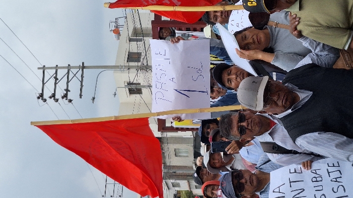 A daylight urban scene depicts a street protest or demonstration involving approximately 20-30 individuals, primarily adults of indigenous or mestizo appearance, in Miraflores, Lima, Peru. The environment features light-colored multi-story buildings and visible utility infrastructure under an overcast sky. In the foreground and midground, participants are closely grouped. Several individuals wear hats, including baseball caps and sun hats, and some wear sunglasses. The central figure in the immediate foreground is an older male wearing a grey cap, glasses, and a dark vest over a striped shirt, with a serious expression. Key objects include: * Two prominent red flags on wooden poles, framing the scene on the left and right. The flag on the left has faint, illegible white text. * A white rectangular placard, held centrally overhead, with the handwritten Spanish text: "PASAJE A 1 Sol." (FARE TO 1 Sol). * A second, partially visible white placard in the lower left foreground, displaying text related to the protest, including "...QUE NO SUBA EL PASAJE" (THAT THE FARE DOES NOT GO UP). The individuals are engaged in a collective action, holding signs and flags, with most facing forward. One person in the midground holds a smartphone upright, potentially recording. The background features a tall metal utility pole with multiple cross arms supporting numerous overhead wires and an attached street light. Behind the pole and the participants, several light-colored buildings with multiple stories are visible, consistent with urban architecture. The sky is uniformly overcast. No specific street names or unique landmarks are discernible to pinpoint an exact location within Miraflores beyond a general urban setting. The demonstration is focused on advocating for a public transport fare of 1 Peruvian Sol.