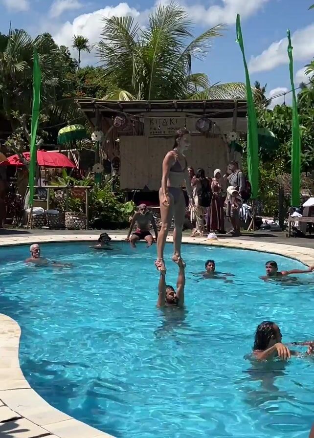 A tropical outdoor scene captures a person performing an acrobatic trick in a swimming pool. A shirtless man stands in chest-deep water, holding a woman on the palms of his hands. The woman, wearing a bikini, balances upright on his hands, her arms outstretched for stability. Several other people are in the pool. In the background, there is a small, rustic stage-like structure with the word "KUDAKI" and the phrase "TEA HOUSE BEANS & GOODIES" visible. The environment includes palm trees and green flags, suggesting a relaxed and festive atmosphere. The sky is blue with some white clouds.