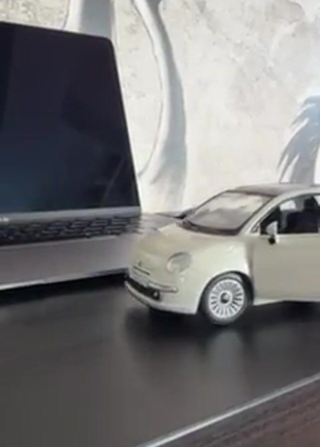 close-up of a small, light-colored Fiat 500 toy car on a dark wooden desk. The driver's side door is open. Beside the car is a closed laptop and a computer mouse. In the background is a light-colored wall with a pattern featuring crane-like birds. The camera slowly pans to the right, keeping the car in the frame.