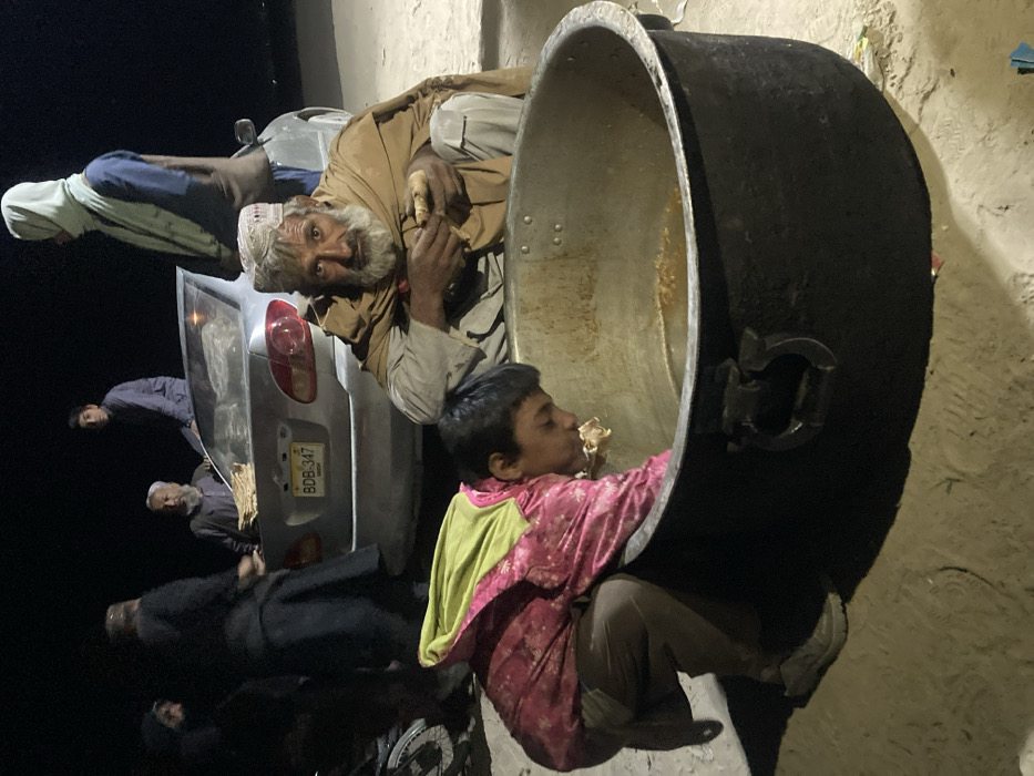 The image captures a nighttime scene in Chaman City Tehsil, Pakistan, depicting a group of individuals gathered outdoors around a large pot and a silver sedan