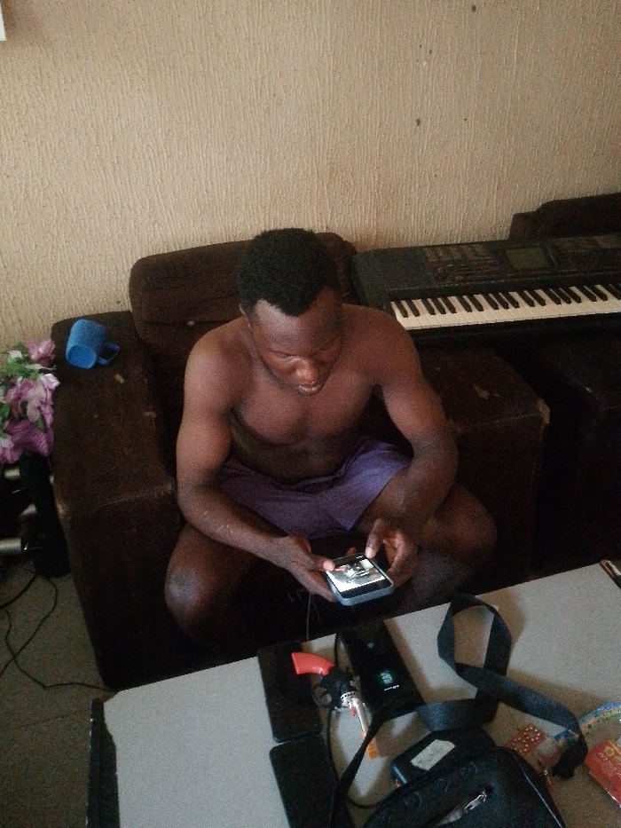 A shirtless man sits on a brown couch, focused on a smartphone in his hands. Next to him rests an electronic keyboard. A blue mug and a bouquet of flowers are also visible on the couch. In front of the man, a gray table holds multiple smartphones, a bag, a lighter, and a set of keys. The room's wall has a textured beige finish.